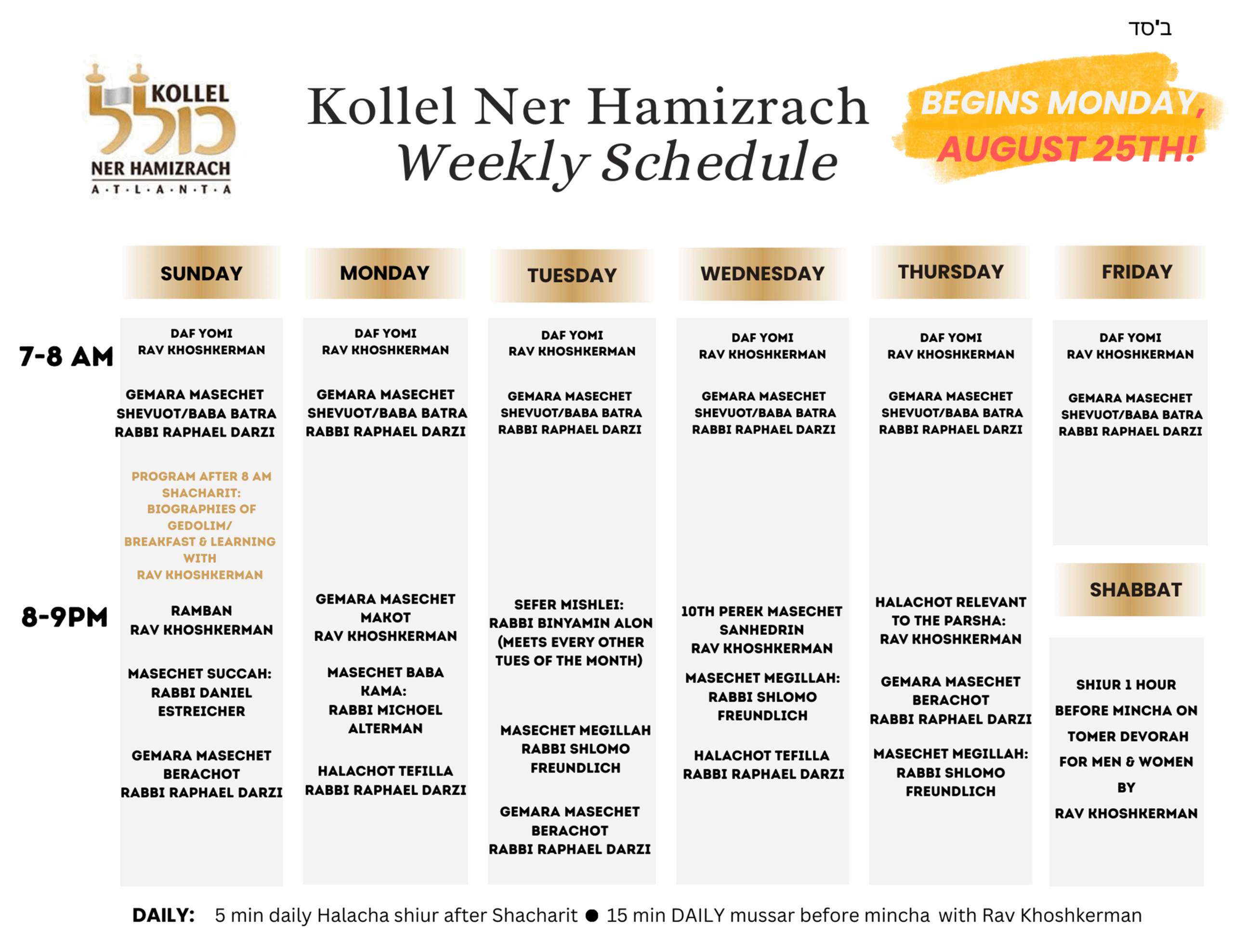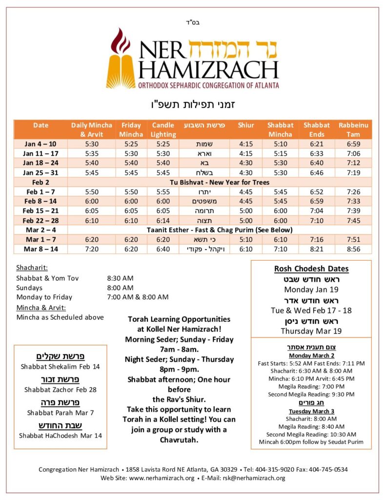 NER HAMIZRACH ZMANIM There is a time for every matter under the heaven. 5786 Kollel Class Schedule – click to view 5786 Kollel Class Schedule5786 ZmanimYamim Noraim & Chagim5786 Kollel Class Schedule View larger / Download5786 Zmanim Yamim Noraim & Chagim View larger / Download Find your daily zmanim at MyZmanim.com.